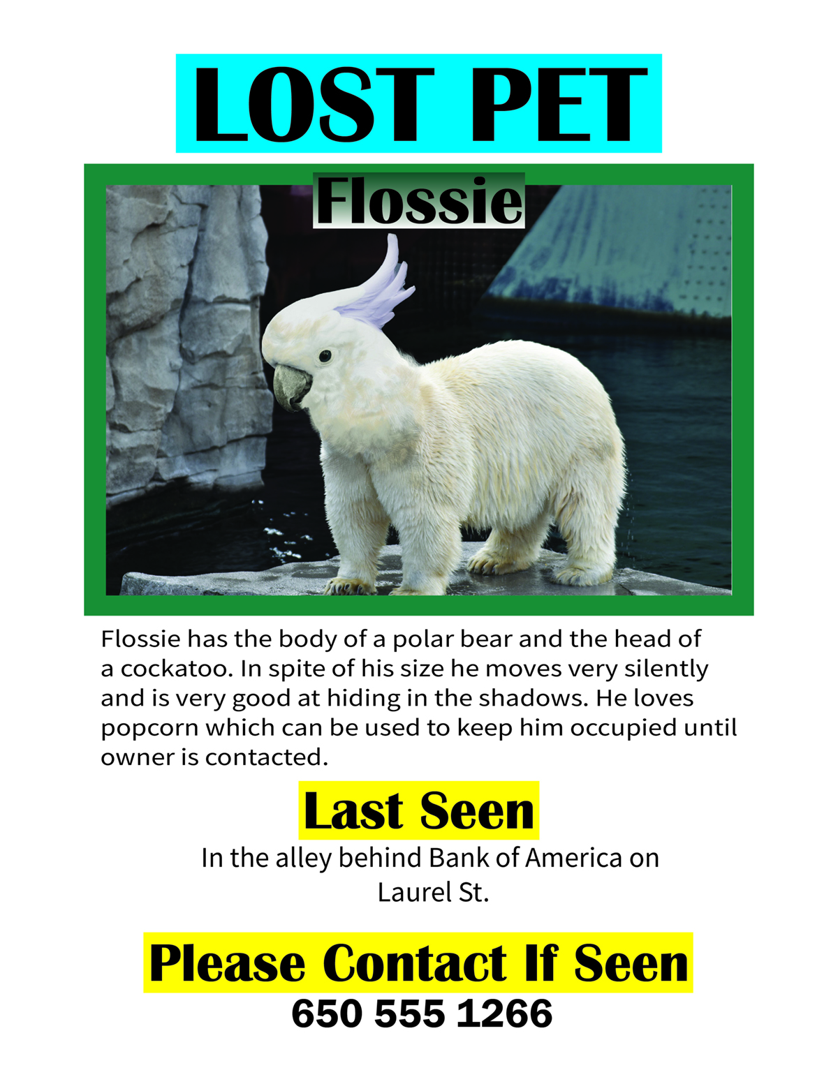 To create Flossie I combined a cockatoo and a polar bear because they were similar in colour. I used colours from the bear's body and the 'fur' brush to hide where they were joined and also to create more shadows on the head which was brighter than the body.