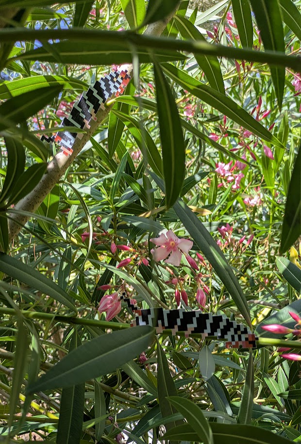 This is a Great Sphinx caterpillar which is about 5 to 6 inches long and loves frangipani leaves. They absolutely freak me out. Even though this was done like an 8-bit image, I didn't expect it to look so realistic. My sons love it and currently have it displayed walking up a lamp in the living room =O
