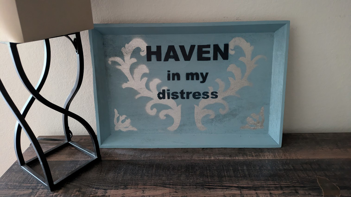 I found an old, wooden, unfinished tray in a thrift store to use for this project. It cost $1.18. I sanded it to clean it up, then spray-painted part of a favourite quote on it. It references how my home is always a haven and I feel comforted thinking about that.